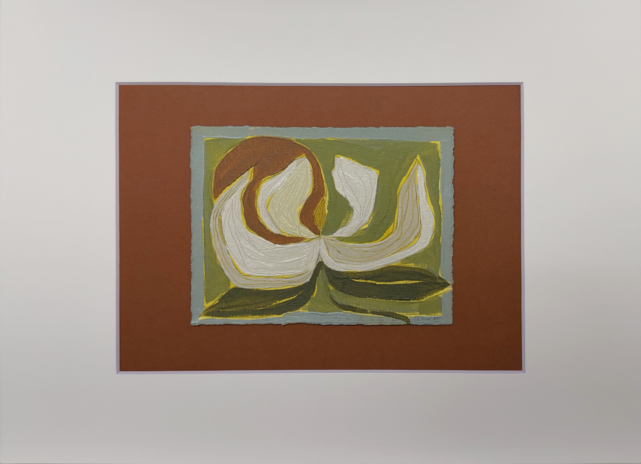 Acrylic paint on hand torn paper. Painting is approximately 4x6" matted with a white matte making it ready for a 9x12" frame (See second photo)